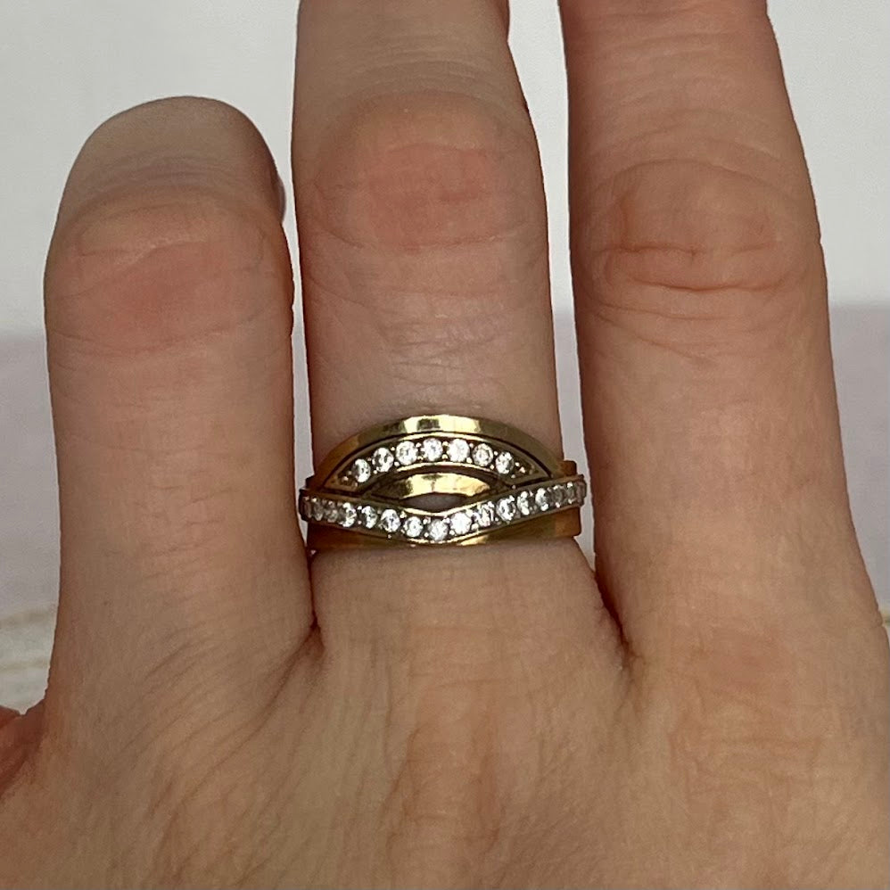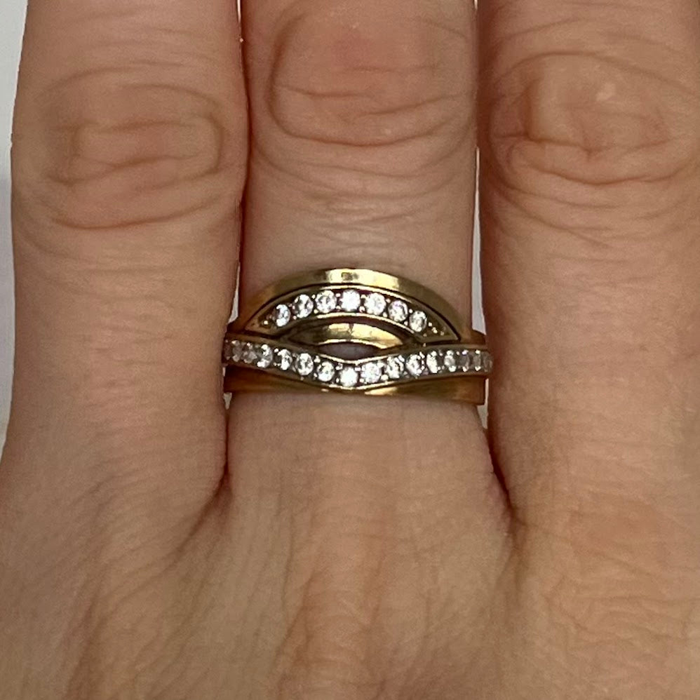 Vintage ring crafted in solid 333 gold (8K), featuring a layered multi-row design accented with small clear stones. The curved bands create a sculptural, dimensional look with a balanced mix of gold and sparkle.